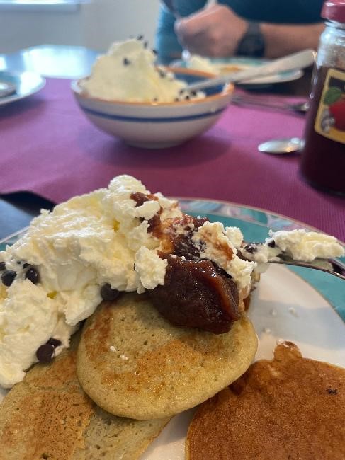 /1 vejce 55g, banán 90g, ghee 10g, švestková povidla 10g, kysaná smetana 100g/